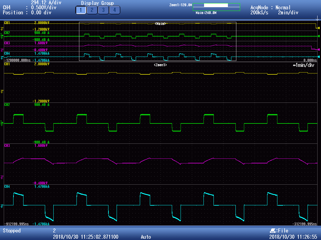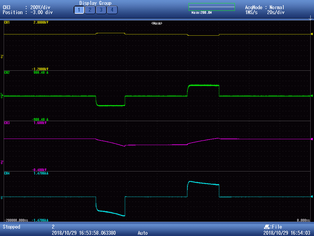 Urban Rail Transit Inverter-Energy Storage type In urban rail transit projects, DC-AC variable-voltage variable-frequency transmission is generally used. The braking method of the vehicle is electric braking (regenerative braking) + mechanical braking. In operation, electric braking is the main method, and mechanical braking is the auxiliary. During the operation of the train, due to the short distance between stations, the train starts and brakes frequently, and the braking energy is considerable. According to experience, in addition to a certain proportion of the energy generated by subway regenerative braking (usually 20% to 80%, which varies according to the train operating density and interval distance) is absorbed and utilized by other adjacent trains, the remaining part will be mainly used by the trains. The recovery resistor is dissipated as heat or absorbed by the recovery device on the line. At present, the main absorption method of domestic urban rail transit is to use resistance energy consumption absorption device to deal with regenerative energy during train operation, which not only wastes energy, but also increases the burden of air conditioning and ventilation devices in the station, and increases urban rail construction costs and operating costs. If this part of the energy can be absorbed and reused, these problems will be solved. Energy storage type, that is, a supercapacitor absorption device. The working principle is that when the DC voltage rises due to the regenerative braking of the train, the equipment works in the charging state and stores the energy in the super capacitor. When the train starts to lower the DC voltage, the equipment works in the discharging state to release the energy in the super capacitor. To the DC traction network, the braking energy is better utilized and the DC voltage fluctuation is smaller. Use effect: CH1: grid side voltage waveform CH2: grid side current waveform CH3: super capacitor voltage waveform CH4: super capacitor charging and discharging current waveform.